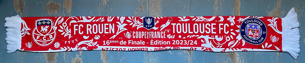Hormis la première qui date de 1985 (et qui n'est pas la plus ancienne de ma collection) j'ai essayé de les classer par ordre chronologique de la plus ancienne (1980/81) à la plus récente mais il y a surement quelques erreurs dans cette chronologie...Vous trouverez ici une écharpe qui n'a pas de rapport avec le TFC il s'agit en effet d'une écharpe faite pour les 32ieme de finale de la coupe de France 2024 2025 qui a opposé au STADIUM l'Union Saint Jean (club de la périphérie Toulousaine de N3) à l'AS Monaco. J'ai donc pour le petit voisin et poucet fait une petite place sur cette page ;)